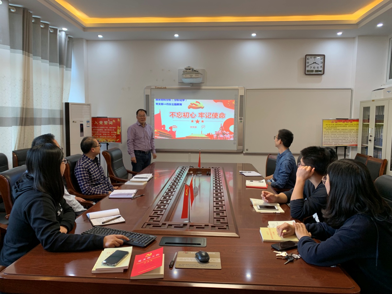 纳米材料分析科技团队党支部在实验楼“党员之家”会议室召开了“不忘初心跟党走、牢记使命见行动”集中学习研讨会,研讨会由支部书记黄克靖主持。