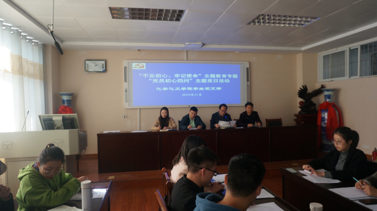 实验楼407会议室召开“初心使命四问”主题党日活动。活动由冷向宇老师主持,各学生支部书记王少单、邓耀辉、赵方方参加会议。