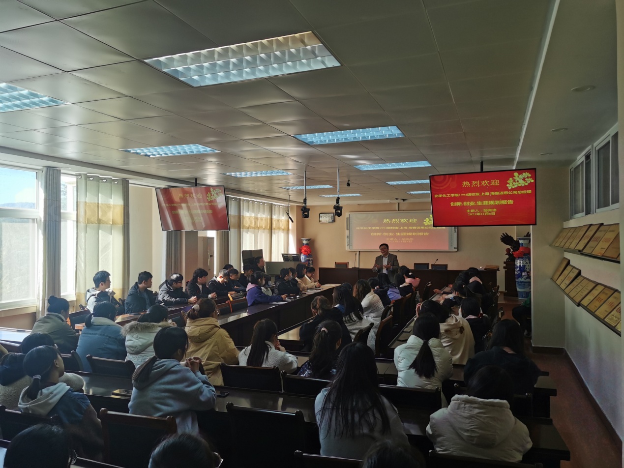首先,邹亮忠结合自身求学、就业、创业丰富经历,为同学们讲解了化学学科发展的相关知识前沿、就业创业前景,强调了化学学科的重要性以及社会经济发展需求、相关专业人才的缺乏。他鼓励同学们要在大学四年生活中注重打好专业知识坚固基础,在日常学习生活中要有奋斗目标、要谦虚谨慎、要努力奋斗。其次,邹亮忠先生讲述了自身求学就业、创新创业的经历,并分享职场就业、创业人生一些经验:一是社会是有规则的,要积极适应社会;二是要提前了解自己热爱的职业并做好职业规划;三是坚持做好一件事力求有所成。接着,邹亮忠先生为大家分享自己关于求学和工作、做人和做事方面的独到人生见解。他提出“成功的标准是不给别人带来麻烦,作为一名大学生要做到独立,要有回报社会的感恩态度,要让别人因为我们的存在感到兴奋。”