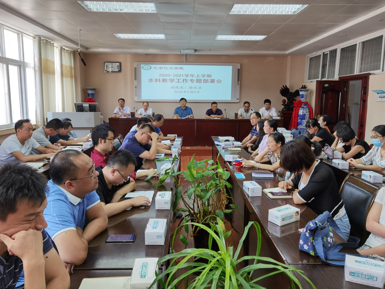 在实验楼会议室召开新学期本科教学工作专题部署会,全体教职工参加会议。会议由党委书记郭鹏主持。