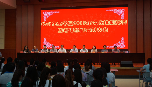 2015年实践技能竞赛暨毕业生考研总结表彰大会在逸夫楼报告厅隆重举行。副校长刘彦明,党委宣传部部长丁少锋,团委书记王建旭,教务处副处长祁传达,学生处副处长赵晨,化院党总支书记周涛,院长杨性坤,副院长归风铁、骆定法莅临大会现场,各年级辅导员携考取研究生的毕业生,2012级全体学生,2013级和2014级学生代表共同参加了本次大会,大会由化院党总支副书记宋力主持。