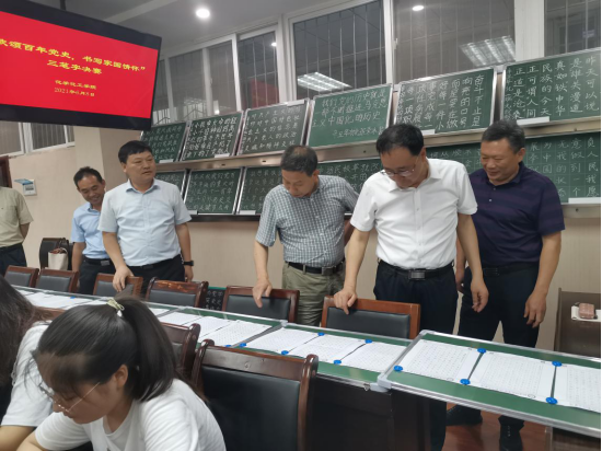 党史学习教育系列活动之“歌颂百年党史 书写家国情怀”三笔字大赛决赛在化学实验楼407会议室举行。副校长刘彦明到现指导。