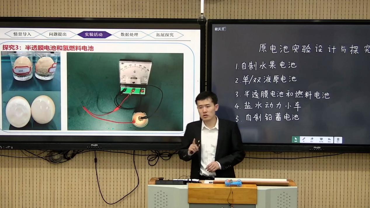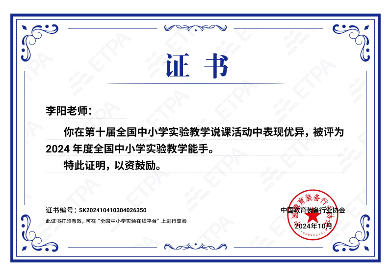在本次活动中,李阳老师的选题为《原电池实验设计与探究》,联系生活实际利用自制教具,结合具体的化学实验从家庭实验、学校课堂、社团活动、社会实践多个角度出发,让学生充分感受化学的魅力。李阳老师在比赛过程中,展示了较强的化学教学基本功,获得了评委专家的一致认可与好评。经过区、市、省赛的层层选拔,荣获2024年度实验教学技能大赛金奖(全省仅7人),2024年度河南省教育系统优质课一等奖,并成功入围教育部第十届全国实验教学说课评比活动(信阳市仅1人)。11月8日,全国中小学实验在线平台公布2024年度全国中小学实验教学能手,李阳老师成功入选。