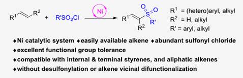 饶伟浩博士课题组在有机化学领域知名期刊《The Journal of Organic Chemistry》上先后发表了题为“Nickel-Catalyzed Direct Sulfonylation of Styrenes and Unactivated Aliphatic Alkenes with Sulfonyl Chlorides”、“Aerobic Copper-Catalyzed Oxysulfonylation of Vinylarenes with Sodium Sulfinates under Mild Conditions: A Modular Synthesis of β-Ketosulfones”(DOI:10.1021/acs.joc.4c00094; 10.1021/acs.joc.4c01660)的研究成果。该研究先后利用磺酰氯和亚磺酸盐作为磺酰化试剂,通过发展配体调控的镍盐催化体系和铜盐催催化体系,分别实现了由烯烃的直接磺酰化反应和烯烃的氧磺酰化反应合成一系列非对称有机砜化合物,解决了非活化烯烃的直接磺酰化反应难题。