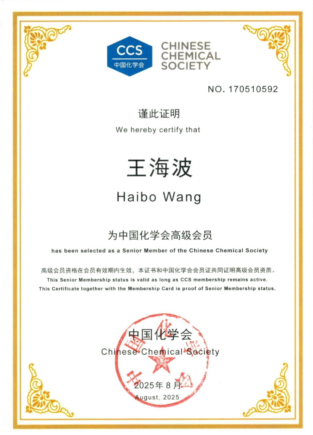王海波教授成功晋升成为高级会员。