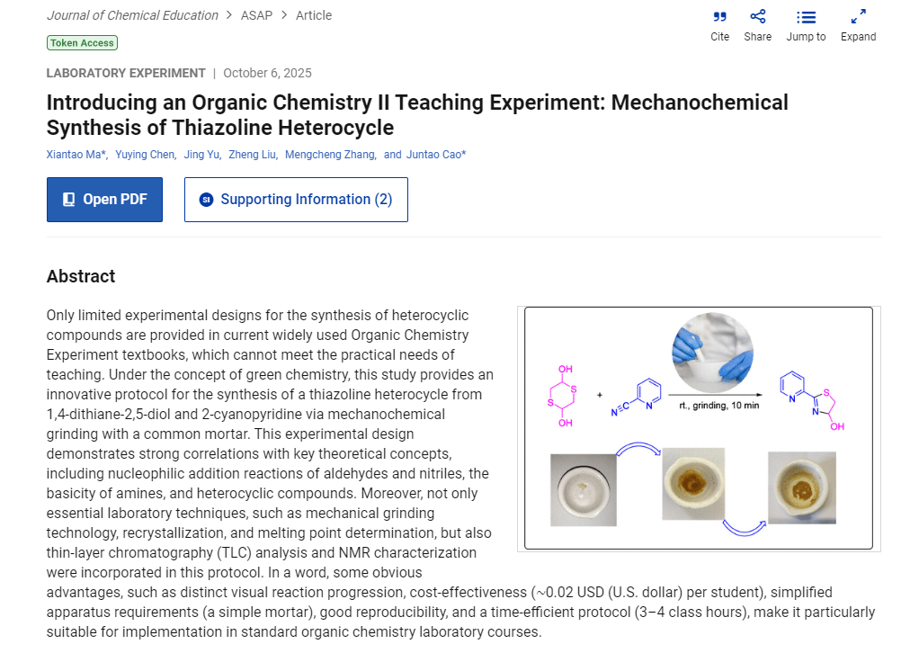 马献涛博士、曹俊涛教授团队在化学教育国际顶级期刊 Journal of Chemical Education 发表了题为"Introducing an Organic Chemistry II Teaching Experiment: Mechanochemical Synthesis of Thiazoline Heterocycle"(J. Chem. Educ. 2025,DOI: 10.1021/acs.jchemed.5c00768)的最新教研成果。这是该教研团队自2024年以161sex
