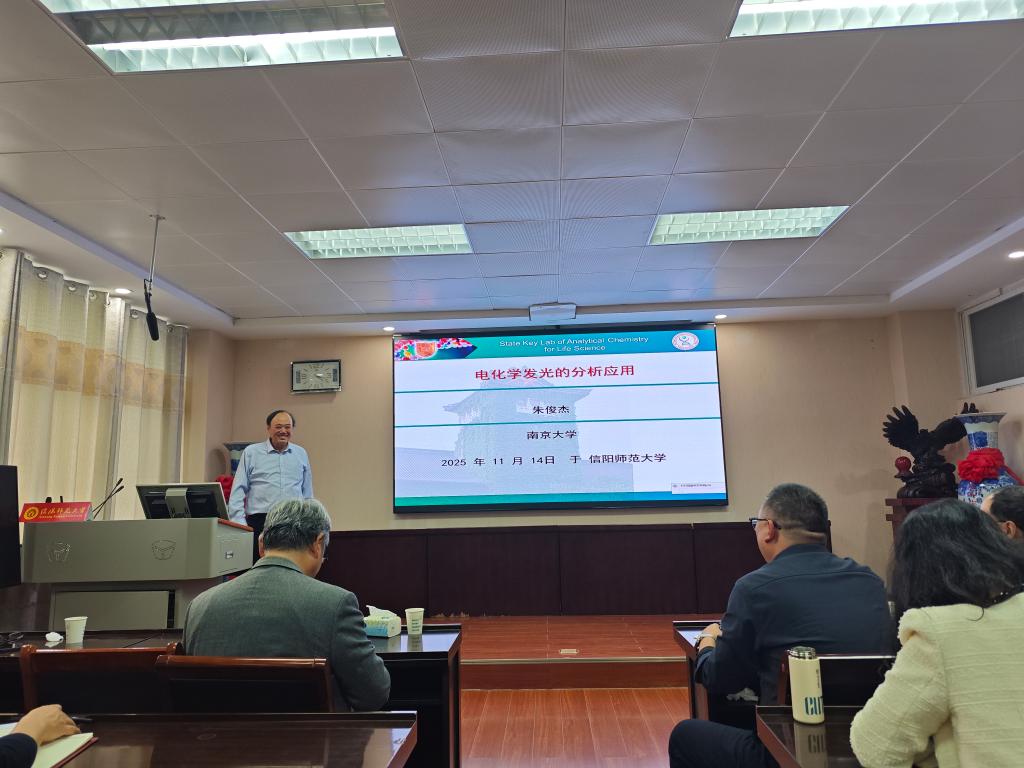朱俊杰教授以“电化学发光的分析应用”为题,分享了前沿学术成果。朱俊杰教授通过图文结合的方式,展示了团队在自调控电化学发光成像、热控电极细胞断层成像、金纳米团簇细胞靶向成像、气体电化学发光传感等多个前沿方向的系列原创性成果,并结合行业发展趋势,对电化学发光技术未来的研究重点与应用拓展方向进行了展望。报告结束后,两位教授与参会师生展开了热烈而深入的讨论,并针对就师生提出的问题进行了详细而全面的解答。