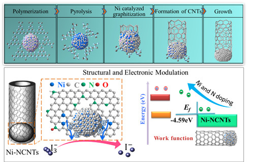 陈明博士在国际著名学术期刊Chemistry of materials上发表了题为“Controlled Synthesis of Nickel Encapsulated into Nitrogen-Doped Carbon Nanotubes with Covalent Bonded Interfaces: the Structural and Electronic Modulation Strategy for Efficient Electrocatalyst in Dye-Sensitized Solar Cells”的研究论文。该论文主要报道了异质键合结构金属-氮-碳纳米管的新型合成方法及其作为染料敏化太阳能电池高效电催化剂的应用性能研究。相比传统的电弧与热解方法,该研究工作创新性地采用醋酸镍和三聚氰胺作为起始原料,利用金属镍催化碳纳米管顶端生长原理,在更低温度下简易有效地制备了金属镍、氮改性的多功能碳纳米管,且金属镍被包埋在碳纳米管内有效防止了镍纳米粒子的氧化、聚集以及腐蚀,同时又高效构建了金属-氮-碳共价的活性催化界面结构。此种设计合成的表面结构与电子改性的金属-氮-碳纳米管作为染料敏化太阳能电池对电极电催化剂,获得了相比贵金属铂对电极更高的催化性能与光电转换效率,化学稳定性更优。该新型碳纳米管制备方法简易,反应温度低,极易用于多功能金属-氮-碳纳米管的工业化生产,在电催化领域具有广阔的应用前景。Chemistry of materials是化学类一区期刊,影响因子9.466,在材料化学领域具有很高的影响力。论文链接://pubs.acs.org/doi/10.1021/acs.chemmater.7b03385