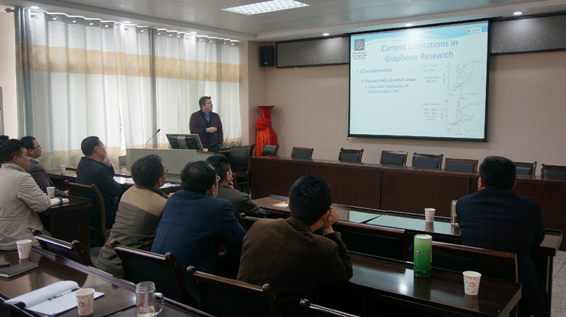 兼职教授表示感谢,并表示将会为双方合作、为信阳师范学院的学科建设和发展贡献自己的力量。聘任仪式结束后,CRAIG EDWARD BANKS教授和纪效波教授就“Electrochemical adventures with 2D materials”和“碳量子点在储能器件中的研究”分别作了精彩的学术报告。两位教授将其研究的精华深入浅出地讲解给与会师生,赢得了现场师生的热烈欢迎。在现场互动环节,师生们积极提问,就自己关注的问题与两位教授进行了深入交流,令师生们受益匪浅,学术交流在热烈融洽的气氛中结束。