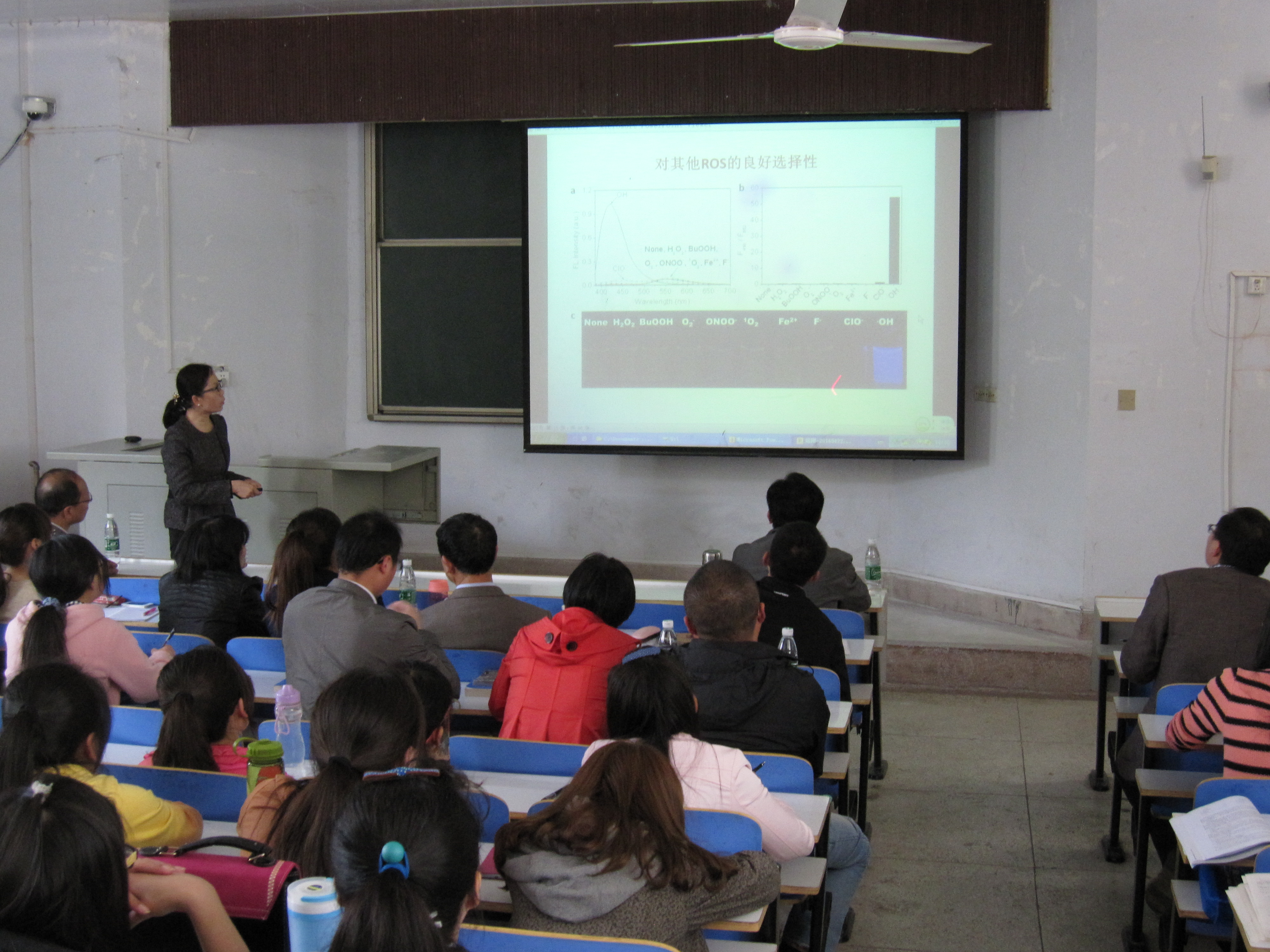 易涛教授首先介绍了响应型分子功能性材料的研究背景,从动力学驱动、热力学可逆开始,讲述了分子敏感材料及对外界刺激的响应能力,重点结合自己的科学研究,从比度荧光探针检测ROS和DNA、荧光开关材料用于活细胞成像和超分子凝胶材料用于可视化检测三个方面,讲授了响应型探针材料及生物成像,易教授精彩的报告赢得了师生的阵阵掌声。会后,易涛教授与161sex