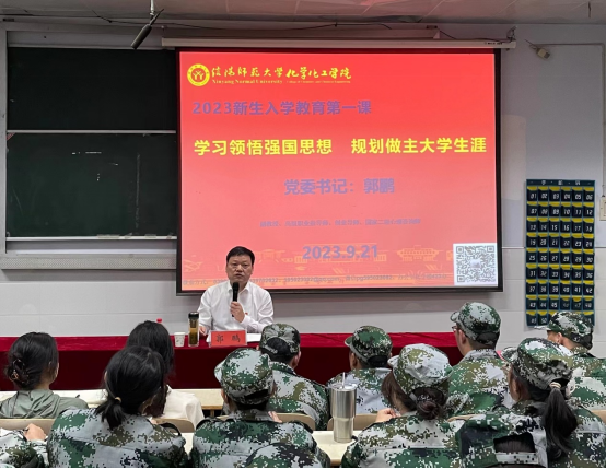 9月21日化学化工学院党委书记郭鹏以《学习领悟强国思想 规划做主大学生涯》为题,为2023级新生上好开学第一课”,引导同学们“扣好人生第一粒扣子”,争做新时代合格建设者和可靠接班人。