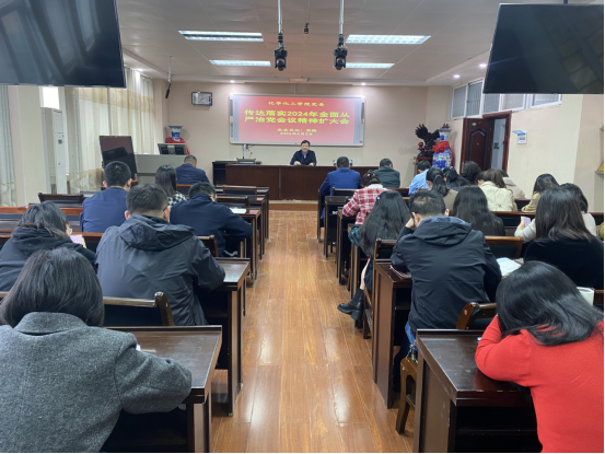 在407会议室举行传达贯彻2024全面从严治党会议精神扩大学习会,学院领导及全体教师参加,学院党委书记郭鹏主持会议。
