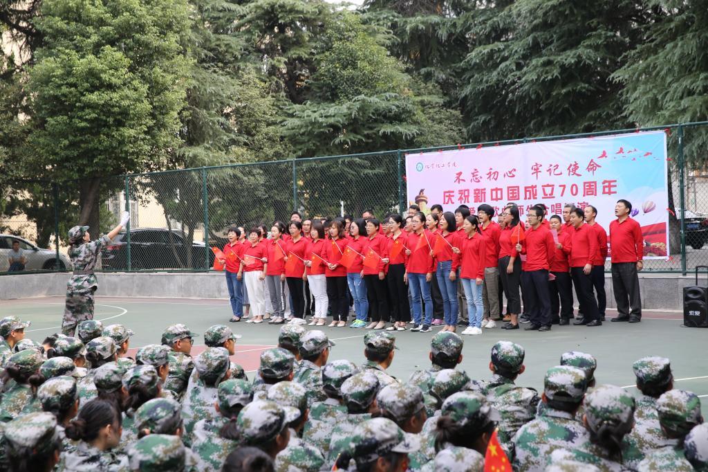 全体师生在樱花广场举办举办“不忘初心 牢记使命”庆祝新中国成立70周年爱国歌曲师生联合汇演。化院全体领导、教师和2019级新生参加汇演。