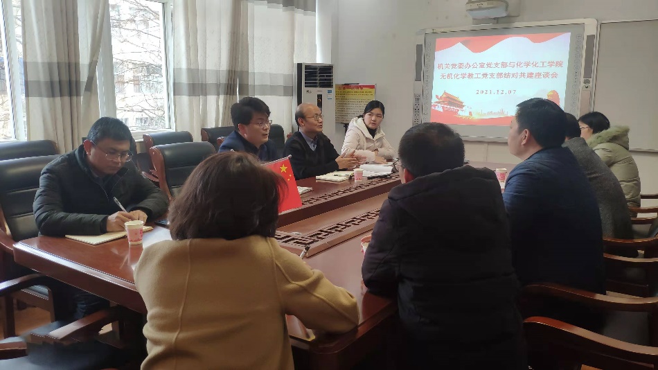 根据《信阳师范学院机关党委各党支部与教学学院党支部、团支部结对共建实施意见(试行)》的安排部署,12月7日下午,机关党委办公室党支部与化学化工学院无机化学教工党支部、2019级化学1班团支部召开结对共建座谈会。机关党委书记朱四倍、副书记徐忠,机关党委办公室王卫杰、范慧珍,161sex 党委书记郭鹏、无机化学教工党支部书记邹国栋及支部党员等一起参加座谈会。会议由郭鹏主持。
