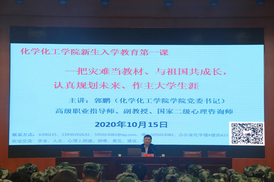 郭鹏宣讲学习贯彻《习近平总书记在全国抗击新冠肺炎疫情表彰大会上讲话》精神,以“弘扬伟大抗疫精神,做好人生规划,做主大学生涯”为主题,为2020级新生开讲了“新生入学教育第一课”。他强调,2020年是不平凡的一年,年初发生了突如其来的新冠肺炎疫情,病毒突袭而至,疫情来势汹汹,是百年来全球发生的最严重的传染病大流行,是新中国成立以来我国遭遇的传播速度最快、感染范围最广、防控难度最大的重大突发公共卫生事件。在党中央坚强领导下,迅速果断地采取严格措施,很好地控制住了疫情,党团结带领全国各族人民,进行了一场惊心动魄的抗疫大战,经受了一场艰苦卓绝的历史大考,付出巨大努力,取得抗击新冠肺炎疫情斗争重大战略成果,创造了人类同疾病斗争史上又一英勇壮举。回眸此次疫情“大考”,抗疫斗争伟大实践再次证明:中国共产党所具有的无比坚强的领导力,是风雨来袭时中国人民最可靠的主心骨;中国人民所具有的不屈不挠的意志力,是战胜前进道路上一切艰难险阻的力量源泉;中国特色社会主义制度所具有的显著优势,是抵御风险挑战、提高国家治理效能的根本保证;新中国成立以来所积累的坚实国力,是从容应对惊涛骇浪的深厚底气;社会主义核心价值观、中华优秀传统文化所具有的强大精神动力,是凝聚人心、汇聚民力的强大力量;构建人类命运共同体所具有的广泛感召力,是应对人类共同挑战、建设更加繁荣美好世界的人间正道。我国国家治理体系和治理能力再次显现出强大生命力。抗疫斗争中产生的“生命至上、举国同心、舍生忘死、尊重科学、命运与共”伟大抗疫精神,正成为推动国家治理现代化的强大精神力量。疫情防控人民战争、总体战、阻击战的重大战略成果,已时刻教育大家,对青年大学生的学业起航、人生发展具有十分重要的指导意义,希望大家要准确解读、自觉弘扬。要积极参与“把灾难作教材,与祖国共成长”主题教育系列活动,把新生入学教育中的理想信念教育、专业思想教育、学业指导教育、职业规划教育、人生导航教育、爱国主义教育、心理健康教育、安全意识形态等专题教育贯通起来,把握方向,打牢基础,扣好人生“第一粒扣子”,争做“有信念、有纪律、有品行、有作为”新时代“四有”好青年。