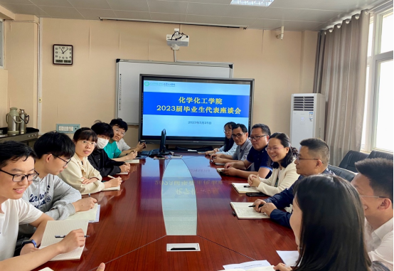 于化学楼210会议室召开2023届毕业生代表座谈会,学院领导、辅导员及毕业生代表共聚一堂,面对面地进行交流与沟通。