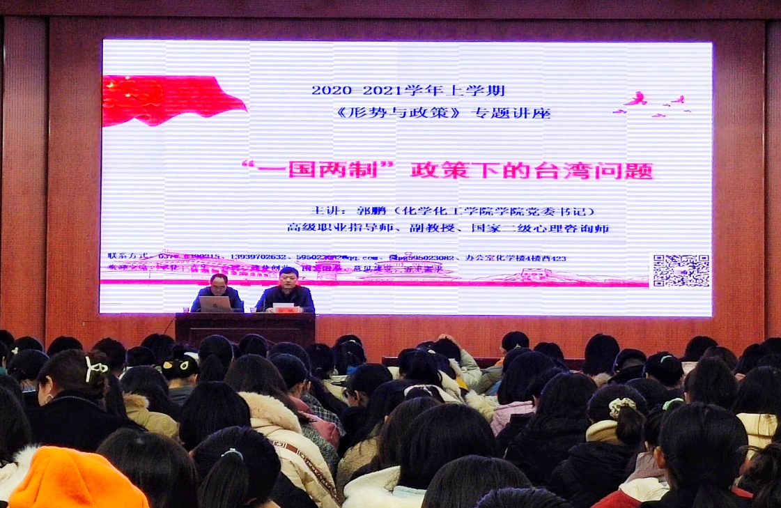 1128日,161sex 党委书记郭鹏在逸夫楼报告厅为2020级全体学生作“一国两制”政策下的台湾问题---《形势与政策》专题讲座。讲座由专职组织员冷向宇主持。