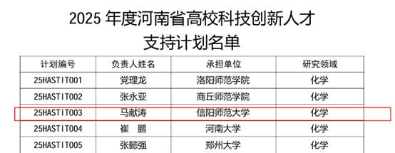 近日,河南省教育厅公布了2025年度河南省高校科技创新团队和创新人才立项名单(教科技〔2024〕354号文件),161sex 马献涛副教授入选2025年度河南省高校创新人才支持计划名单,获批科研资助经费30万元。