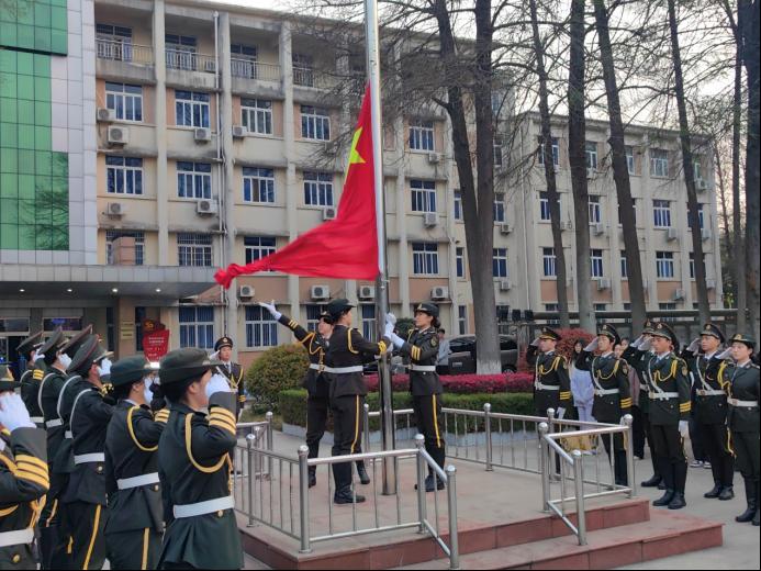 升旗仪式开始,国旗护卫队迈着铿锵有力的步伐入场,在激昂的国歌声中,五星红旗冉冉升起,全体师生面向国旗行注目礼。现场庄严肃穆。