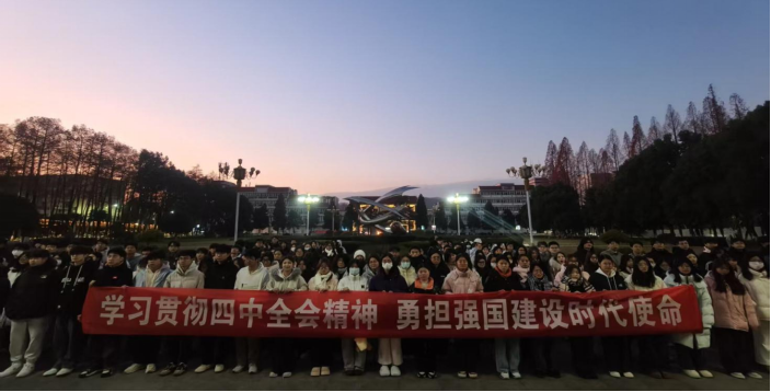 在明德广场举行“学习贯彻四中全会精神 勇担强国建设时代使命”主题升旗仪式。学院党委副书记曲剧、副处级辅导员冷向宇、辅导员严赫及2025级全体学生共同参加此次活动。