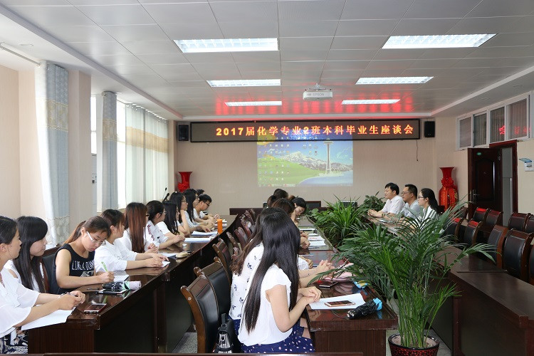 2017届毕业生座谈会在化学实验楼407会议室召开,化院党委书记郭鹏携毕业班班主任曹俊涛、路振国对话四十余名毕业生代表,与他们话青春、话成长、话毕业。会议由学院分团委王丽霞主持。