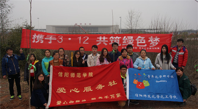 青年化学研习社“携手3·12,共筑绿色梦”义务植树活动于信阳高铁站率先启动。在化院团委老师路振国的带领下,志愿者携带劳动工具与待栽树苗前往目的地,用双手栽下遍地绿色,以行动践行环保理念。青春携手、彰显环保之志――贤山环保之旅随即于3月13日由爱心服务社组织开展。此次赴贤山为环保助力活动旨在深化文明出行意识,为建设文明信阳打下基础。凝聚爱心,传递温暖,3月19日,爱心服务社携手特殊教育学校聋哑学生为浉河整理仪容,结伴同游南湾湖。由161sex