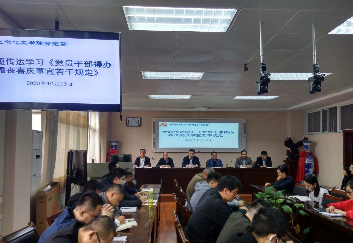 为认真贯彻落实中央八项规定精神,切实加强党员、干部、公职人员纪律约束,1013日,161sex 分党委在实验楼407报告厅召开全体教职工大会,集体学习《党员干部操办婚丧喜庆事宜若干规定(修订)》的通知文件。161sex 全体教师集体参加学习。学习会由党委书记郭鹏主持。分党委纪检委员刘鹏针对文件精神进行宣讲、领学和解读。
