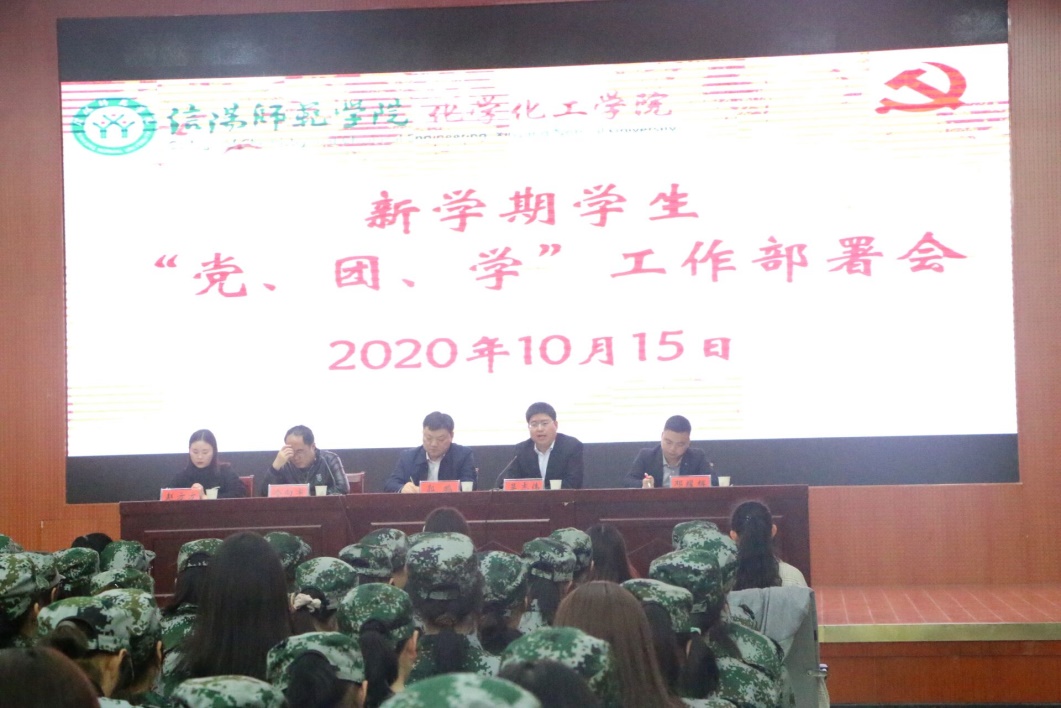 20201015日,161sex 在逸夫楼报告厅召开新学期党、团、学工作部署会。学院党委书记郭鹏、副书记吴志伟、分团委、学工办全体成员出席会议,全体学生党员、团委学生会社团干部、全体新生一起参加了会议,会议由团委书记邓耀辉主持。