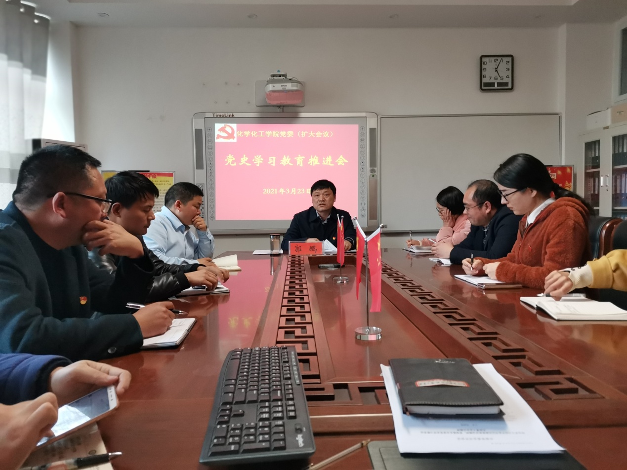 郭鹏指出,学院分党委已拟订党史学习教育工作方案,根据上级党委部署和要求,已成立领导小组,研究确定好学习教育安排,要把握7月1日前各项工作安排时间节点,有序一体推进。