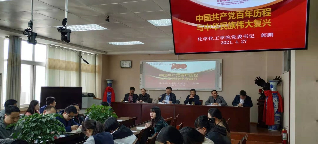 党委书记郭鹏以《中国共产党百年历程与中华民族伟大复兴》为题,在化学楼407报告厅为学院师生党员开讲党史学习教育专题党课。