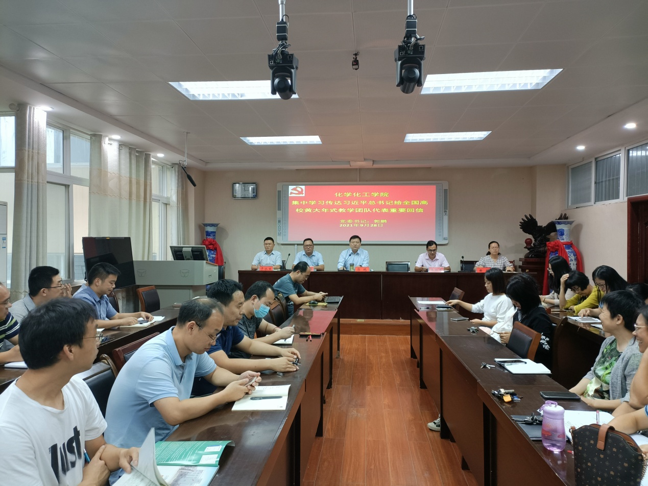 在化学楼407会议室召开全体教师大会,集中学习第37个教师节前习近平总书记《给全国高校黄大年式教师团队代表的重要回信》(简称《回信》)、传达2021年学校中层干部培训暨秋季开学工作会议精神。会议由学院党委书记郭鹏主持。