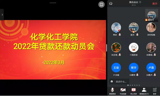 赵方方老师主持,2023届贷款毕业生、各班班长、助贷委员参会。