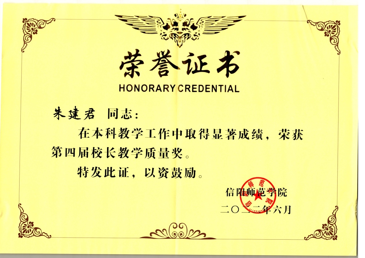 2022年6月,信阳师范学院发布《关于公布第四届校长教学质量奖评选结果的通知》,经个人申报、学院推荐、资格审查、学校初评、学校终评、学校公示、校长办公会议审议等严格程序,全校评选出10名教师为第四届“校长教学质量”奖获得者。161sex 教师朱建君博士荣获信阳师范学院第四届“校长教学质量奖”。(161sex 教学办供稿 王红军 冷向宇审稿 郭鹏审核)