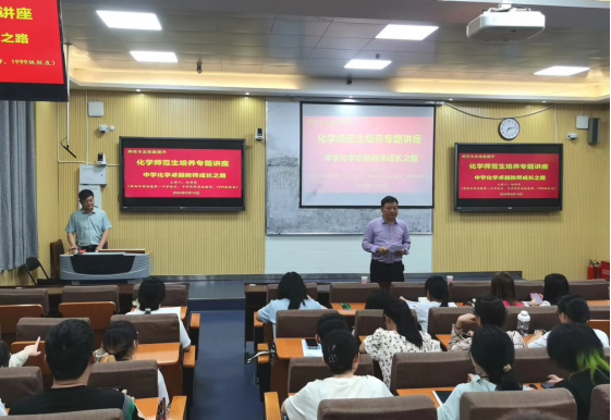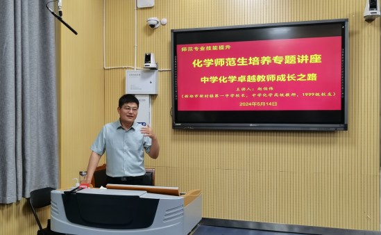 为提升师范生师范技能,培养师范生教学实践能力,强化教师职业理想与职业信念,5月14日,161sex 专门邀请河南省骨干教师赵伯伟校长在教四T-2开展“中学化学卓越教师成长之路”专场报告。学院各年级师范生代表140余人到现场聆听报告。报告会由161sex 党委书记郭鹏主持。