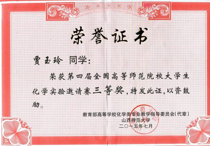 第四届全国高等师范院校大学生化学实验三等奖——贾玉玲